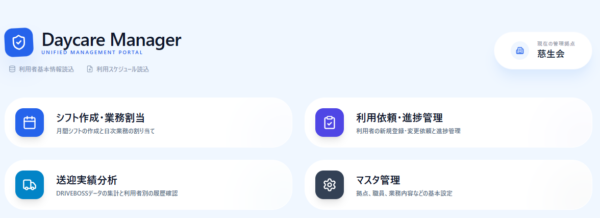 本システム「Daycare Manager」は、通所介護施設(デイサービス)における業務効率化を目的とした統合管理ポータルです。 以下の4つの主要機能を提供します。