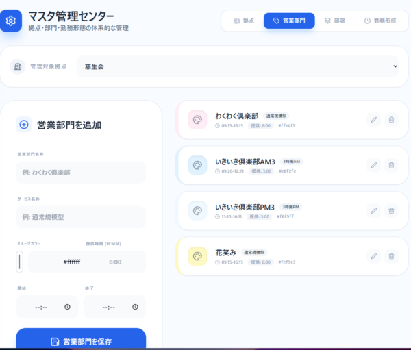 - 部署 (DEPARTMENT): 「介護部」「送迎部」などの組織を設定。