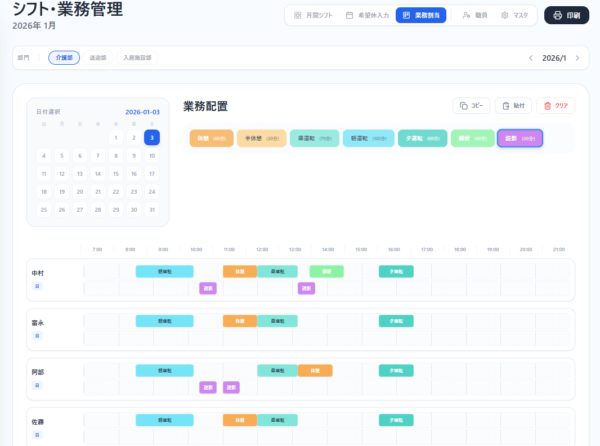 - シフト作成・業務割当: 職員の月間シフト作成と、日ごとの詳細な業務配置(タイムライン)。