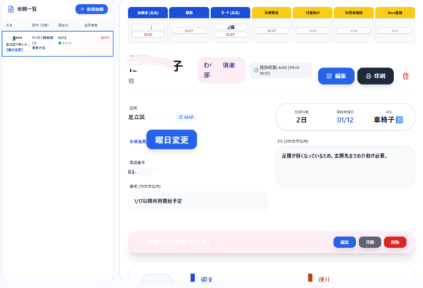 - 利用依頼・進捗管理: 利用者からの新規・変更依頼の管理と配車調整。