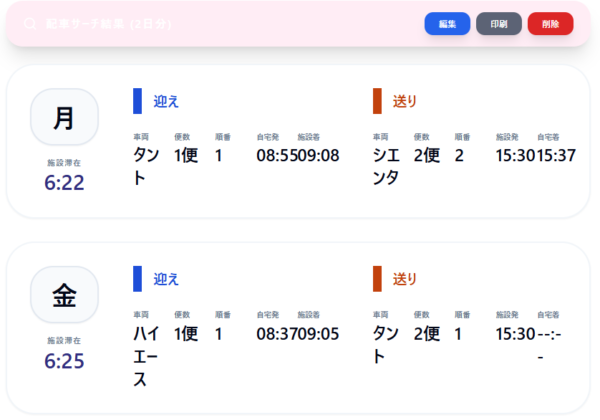 - 曜日ごとの「迎え」「送り」の実績が表示されます。
