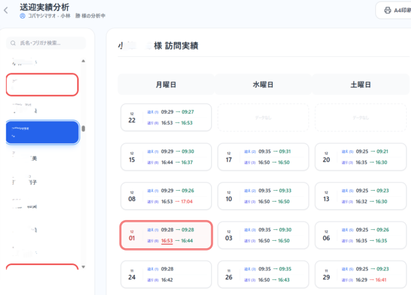 4.送迎時間変更アラート 前週と10分以上の乖離が有れば全体を赤戦で囲ってc不意を促します。 同時に一覧リスト上の名前も赤枠で囲われるので、詳細を見なくとも、時間変更を知らせる利用者様が分かります。
