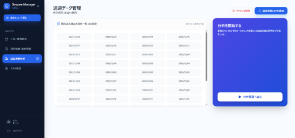 - 利用者基本情報読込: 利用者マスタ(CSV)を読み込みます。送迎管理や分析で使用します。