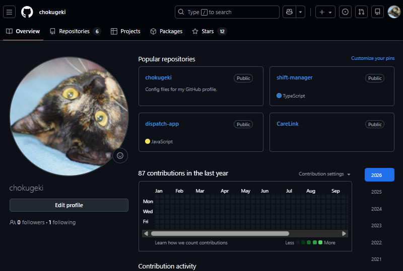 - Repositories: 公開/非公開リポジトリ一覧。